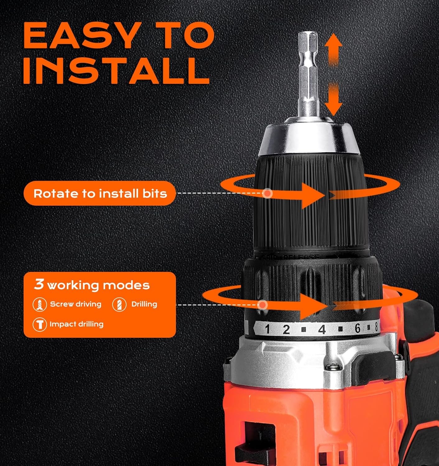 • ? [2 Speed Settings & 25+3 Position Clutch] Our cordless drill provides the strongest torque of 60Nm(531in-lbs), equipped with a 21-Volt, 1.5AH Lithium-ion battery. It features a 3/8in keyless chuck with 25+3 position clutch adjusts torque output to control the depth of the screw or fastener. Forward and Reverse modes switch, 2 variable speed settings (0-350 rpm/0-1800 rpm) and 3 in 1 working modes (screw driving, drilling, impact drilling) helps you complete a wide range of applications.