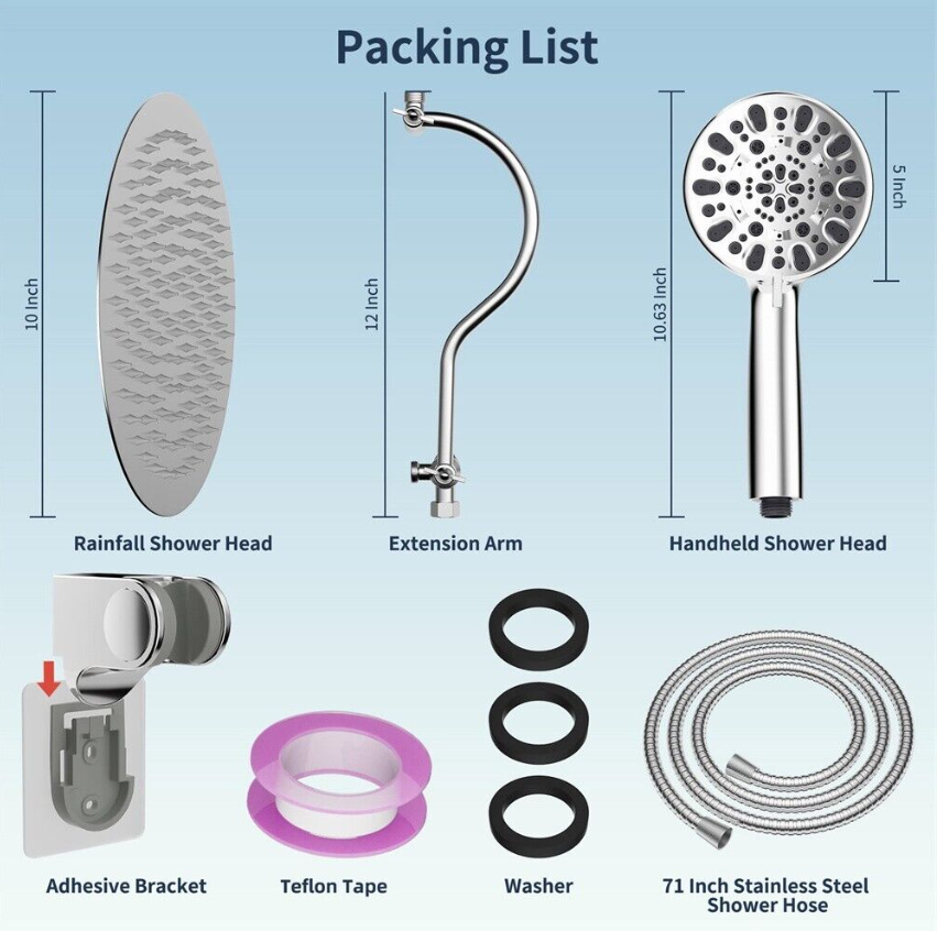 Excellent Shower Head Combo: This hand shower combination comes with 10 inch large round rainfall shower head, chrome face 7-Spray settings handheld shower head, 71 inch metal stainless steel shower hose, 12 inch shower head extension arm, adhesive shower head holder, washer, teflon tape, and installation manual. All metal solid Brass stainless steel extra long 71 inch shower hose is made of odorless EPDM material that can be used in high pressure and high temperature environment.