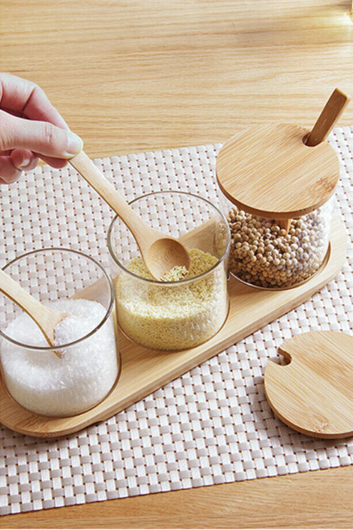 Spice bottles set includes 3 pieces glass Spice Jars, 3 Lids, and 3 spoon and 1 tray, simple and refillable.