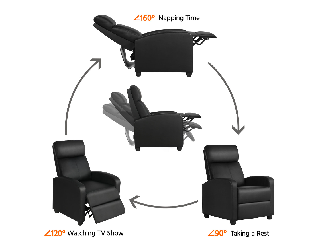 • 【THREE RELAXATION MODES】: You can enjoy your favorite sitting positions on this adjustable reclining chair, no matter you prefer sitting up straight or with your legs up or lying flat. By a simple pushing at the backrest, the footrest instantly pops up and stops at any angle from 0 to 90 degrees.