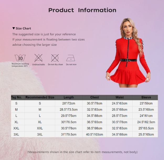 Size ChartThe suggested size is just for your reference. If your measurement is floating between two sizes, advise choosing the larger size. (Measurements shown in the size chart refer to item measurements, not body)